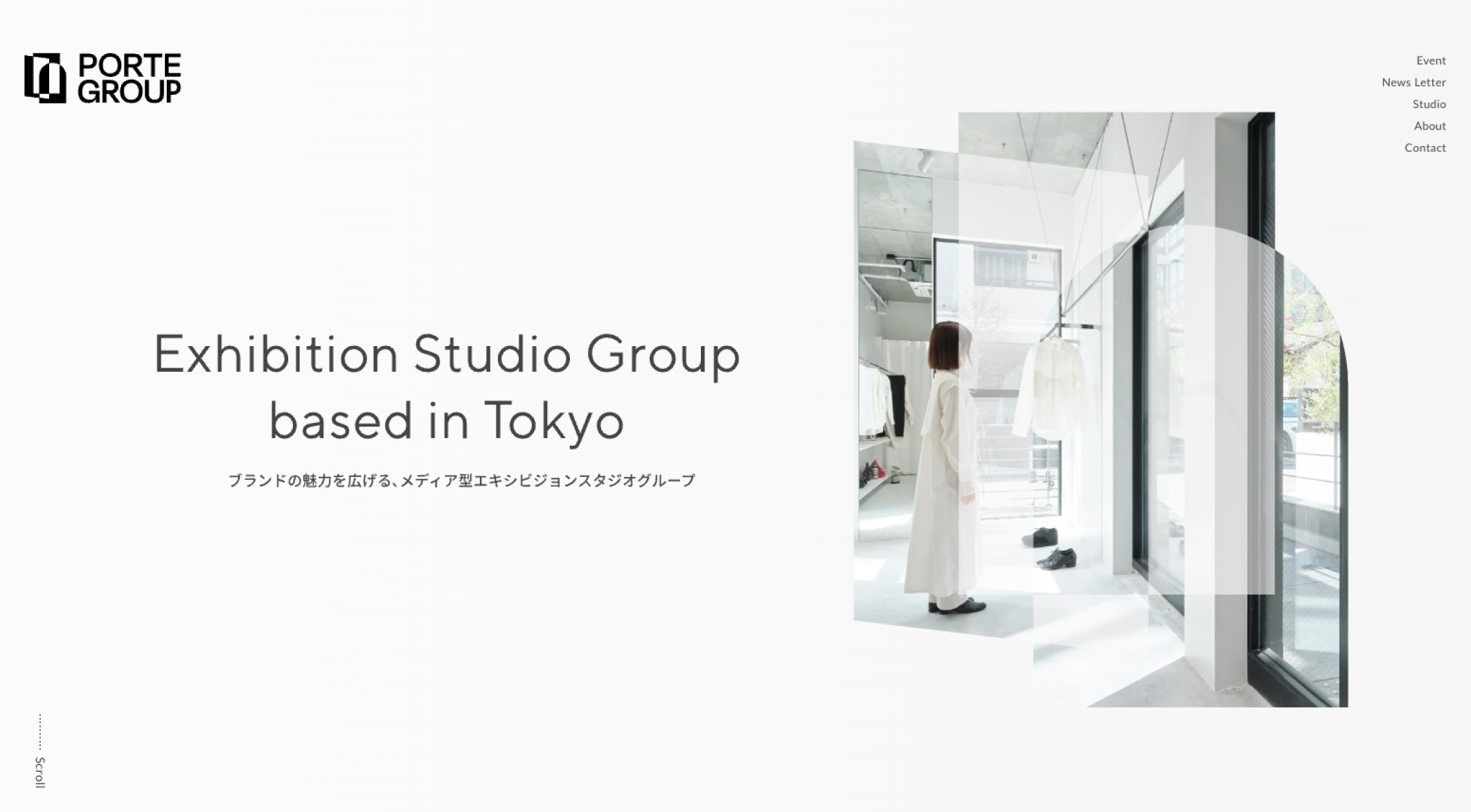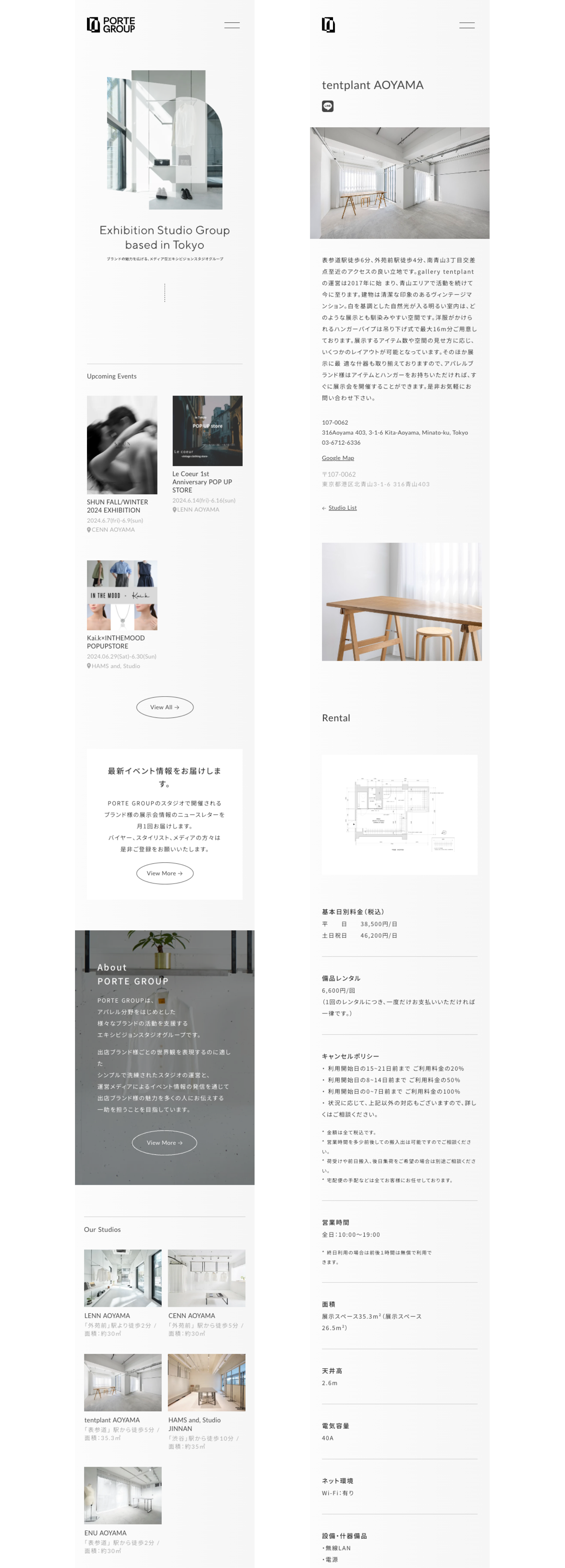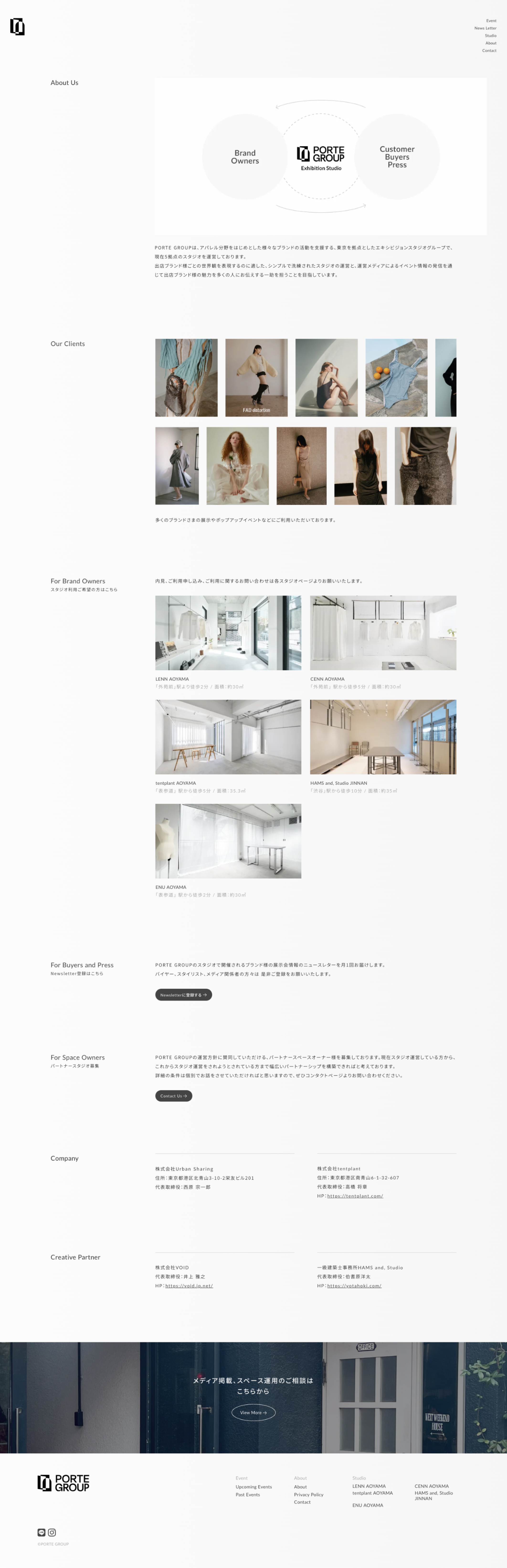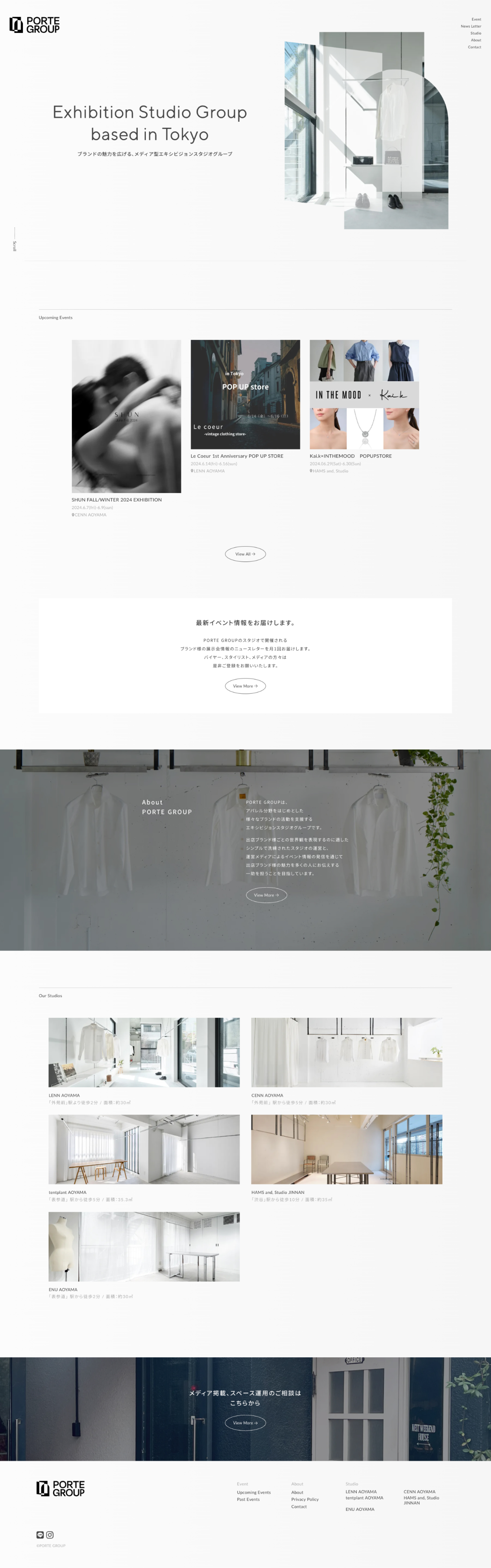 様々なブランドの活動を支援するエキシビジョンスタジオグループ「PORTE GROUP様」のWebサイト制作を担当しました。実装はノーコードツールSTUDIOを使用しています。 気鋭のアパレルブランド様からの出展が多く、運営スタジオはいずれもブランドの世界観を表現しやすいシンプルで洗練された空間を心がけているという点から、サイト上でも無垢でありながらも洗練された印象を感じられる品と余裕のある表現を心がけました。