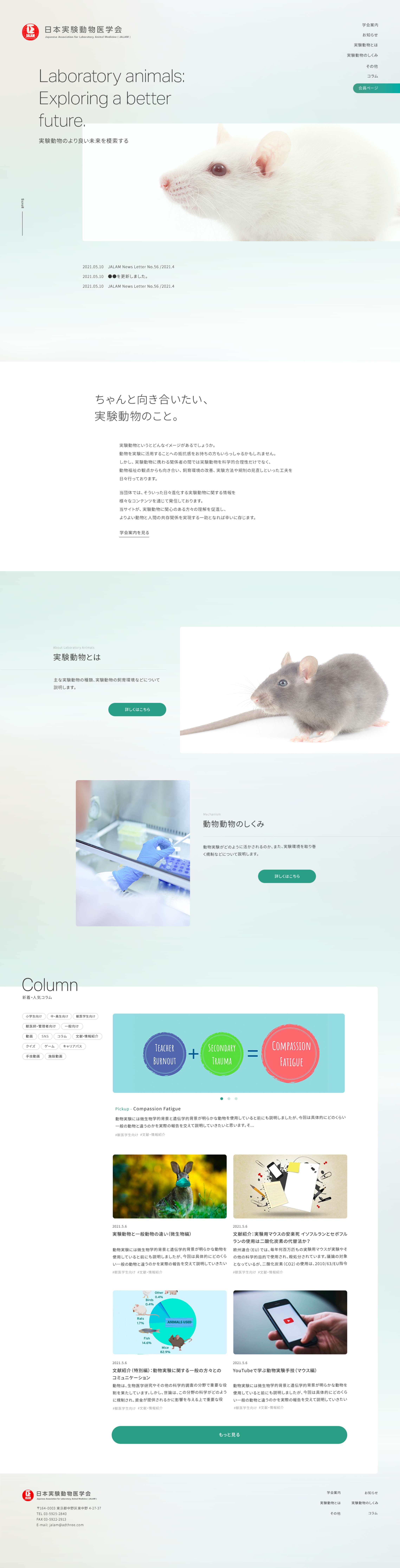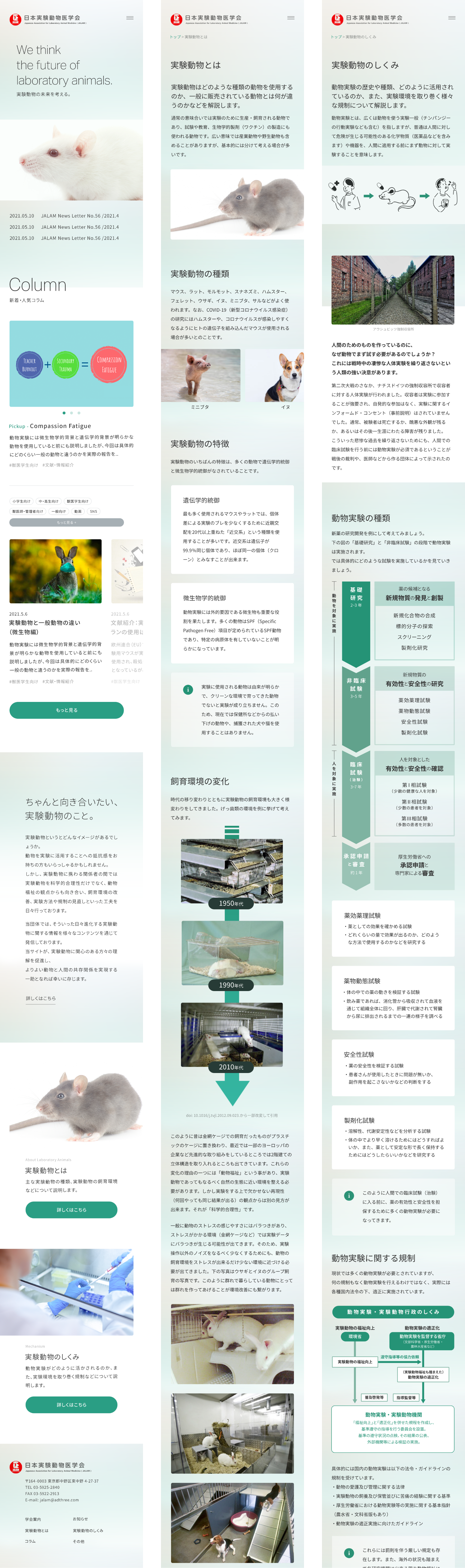 実験動物に関する様々な情報を発信する学会の公式サイト。 デザインおよび実装(Wordpress構築含)を担当しました。 「真摯に取り組んでいるのだが、扱っている分野からどうしても批判的な声をいただくことが多い」というお悩みがあることを知り、少しでもそのイメージを緩和できるよう、学会としての知的なイメージの一方で、柔らかい配色で暖かい印象も織り交ぜたデザインを目指しました。 Director : Kengo Koma