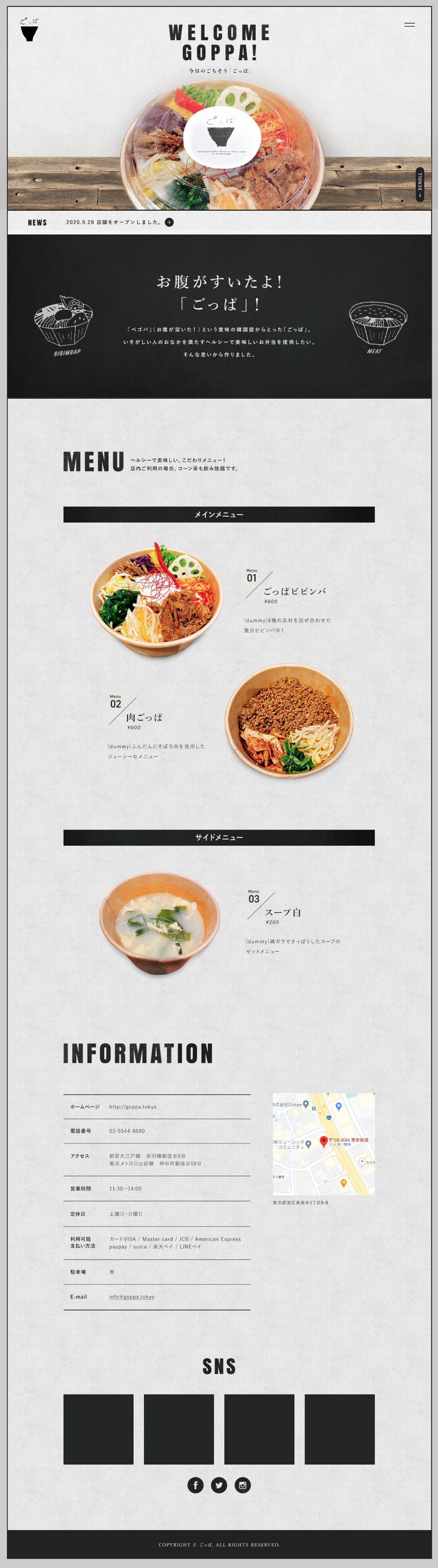麻布に位置するごはんカフェGOPPAの公式サイト。デザインおよびコーディングを担当しました。インダストリアル感のある空間をサイトからも感じられるよう装飾やフォントなどを工夫しております。 Director : Wakana Saito