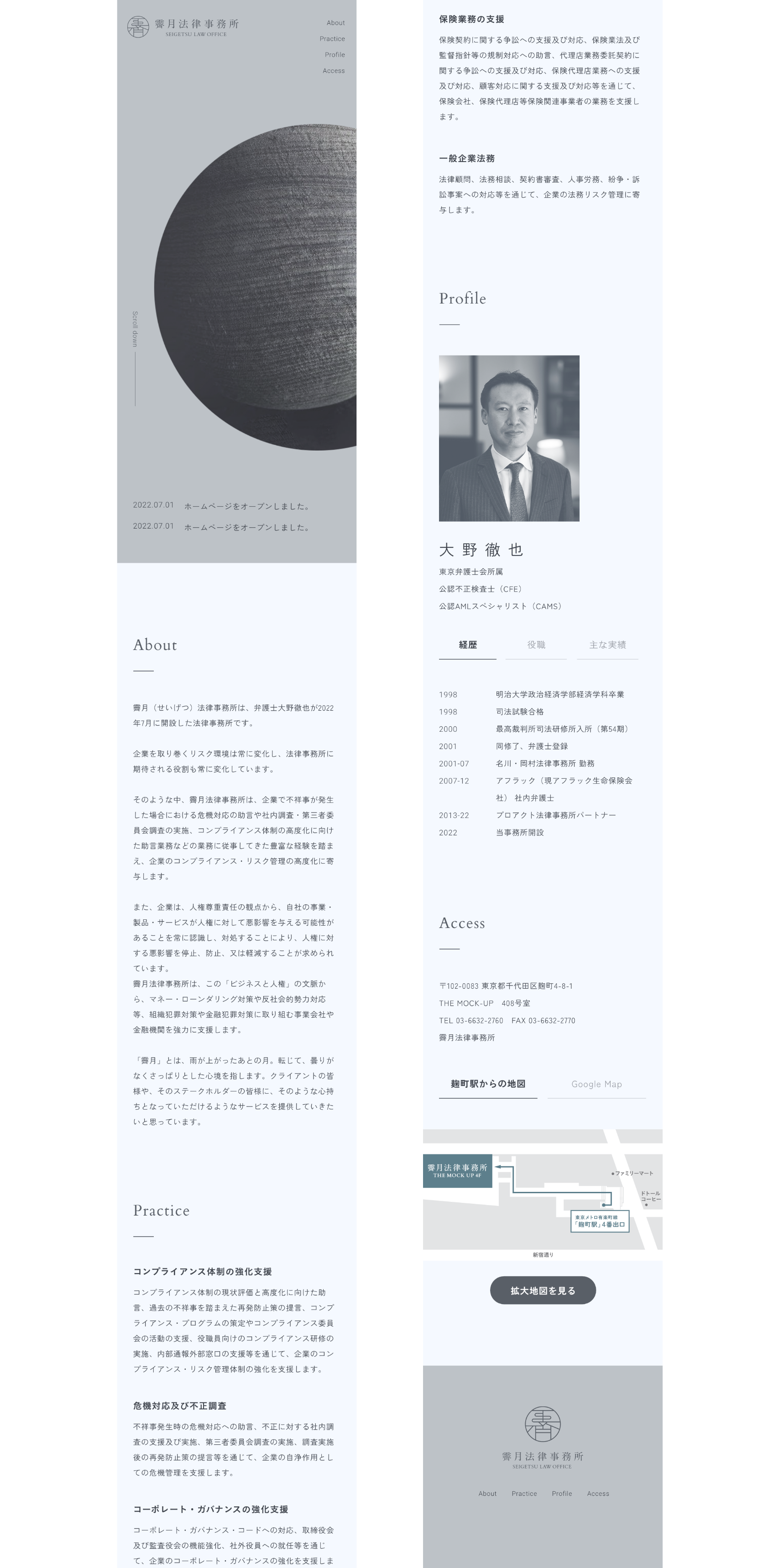 コンプライアンス、不正対応・調査、マネロン・反社対応を専門とした法律事務所である「霽月法律事務所」様のWebサイト制作の設計・デザイン・実装およびロゴデザインを担当しました。 「法律事務所というよりデザイン事務所のような趣のサイトにしたい」「シンプルでモダンなサイトにしたい」というご要望や、事務所名が持つ「雨後の月」「曇りのないさっぱりとした様子」といった意味から着想し、デザイン性はありつつもすっきりとした印象のWebサイトを目指しました。