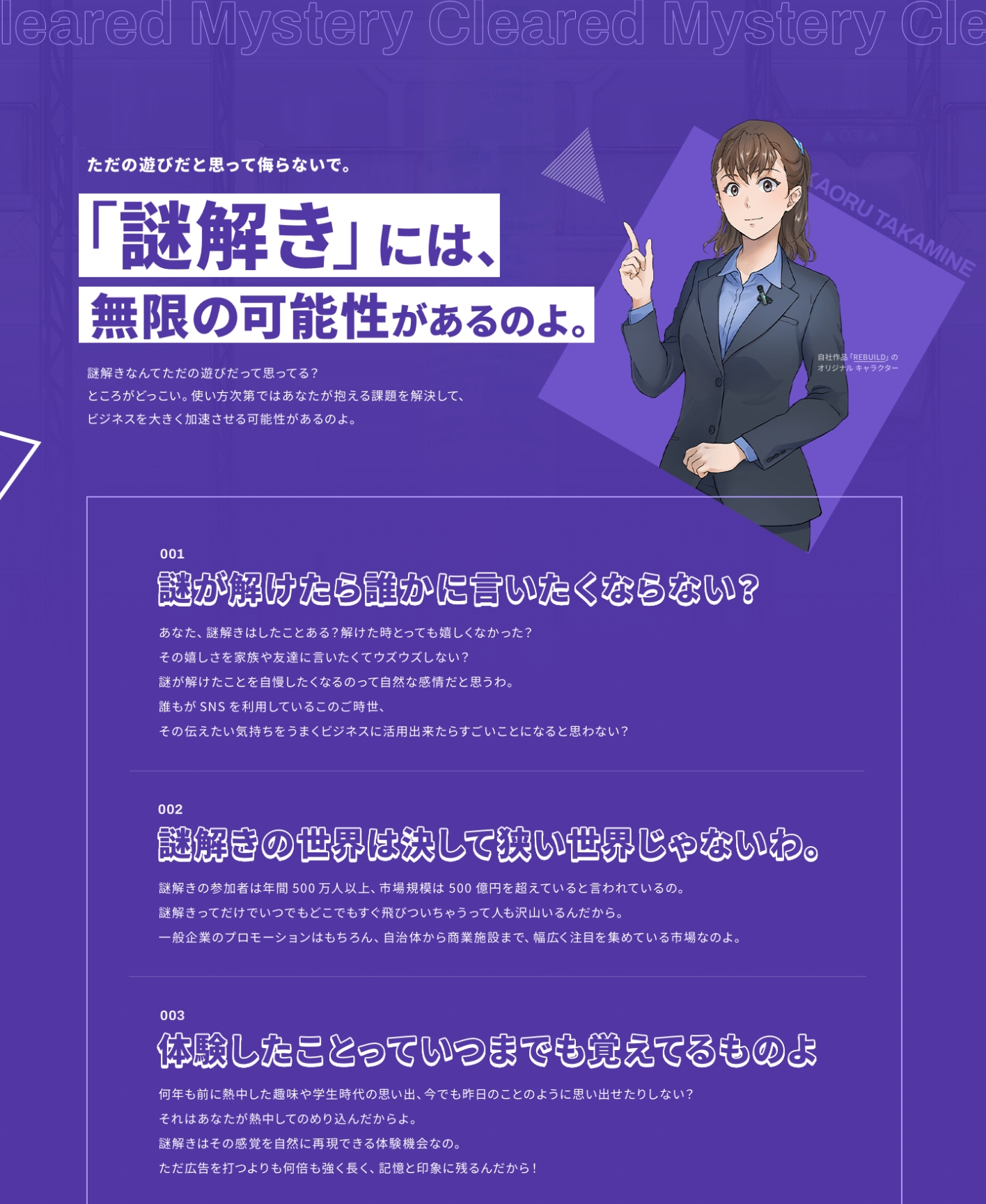 企業の企画・広報担当者様や広告代理店様などがメインターゲットとのことで、謎解きをただ楽しいだけのイベントとしてだけでなくビジネス視点でも活用できることをロジカルに説いた構成と、先進性や誠実性を感じられるモダンなコーポレートサイトらしいデザインを意識して制作しました。